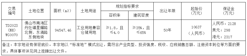 八、自本次公告起至网上挂牌截止期间,如有关于本宗地竞买文件的修改、澄清、说明等将通过网上交易系统以及佛山市南海区人民政府网发布,请有意参与竞买者密切留意。其它未尽事宜,详见本宗地的网上挂牌出让文件。