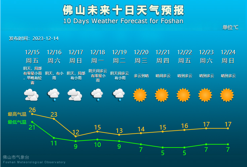 佛山市气象台预报,12月16日凌晨起寒潮携大风和小雨影响佛山,促使气温急降,15日深夜至16日夜间气温将从23℃降至11℃。展望17日至19日阴雨湿冷;受新冷空气补充影响,20日起转晴冷,21日和22日早晨将出现过程最低气温5℃。