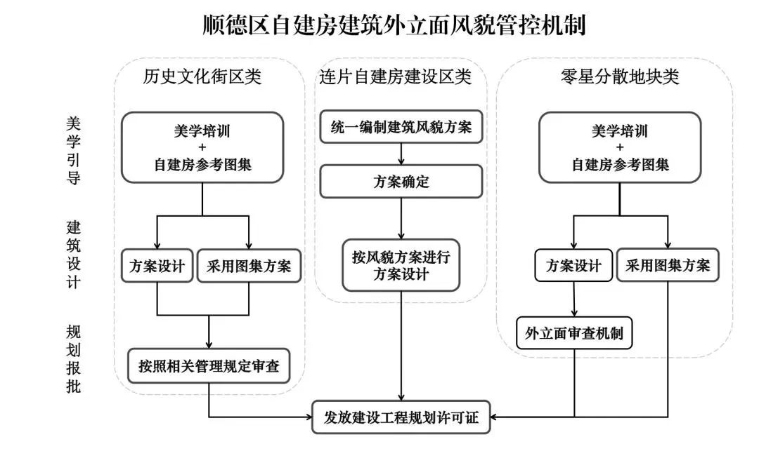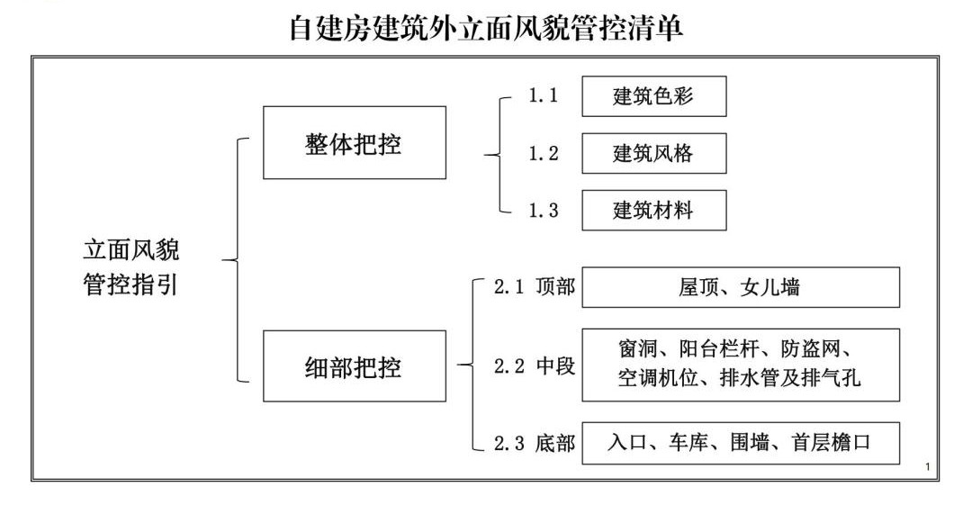 《指引》指出,顺德区内自建房新建、改扩建,应按规定办理建设工程规划许可证。审批管理要求在现行《顺德区私人住宅建设规划管理规定》基础上,补充对建筑外立面明确审查要求,也就是在目前“审层数、审高度”的基础上,增加“审美学”,明确整体层面审查建筑色彩、风格、材料等设计要素,细节层面审查建筑顶部、中部、底部等设计要素,同时对各类要素设置正负面清单进行设计引导,并鼓励个性化的审美设计,引导提升新建自建房设计水平。
