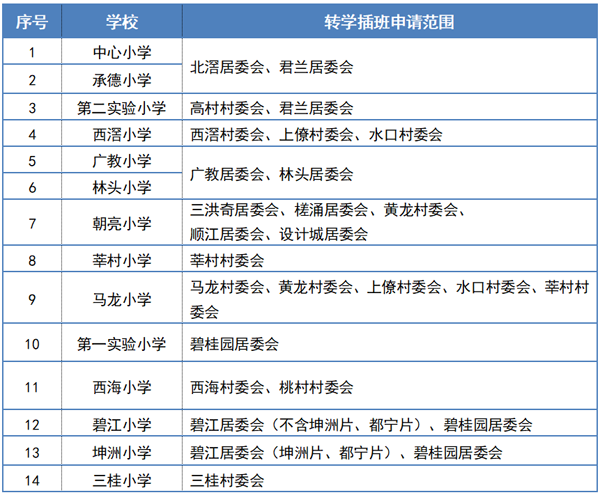 说明:如申请的学区学校某个年级没有学位可供转学插班,请到北滘镇其他有学位的公办学校进行转学插班报名。
