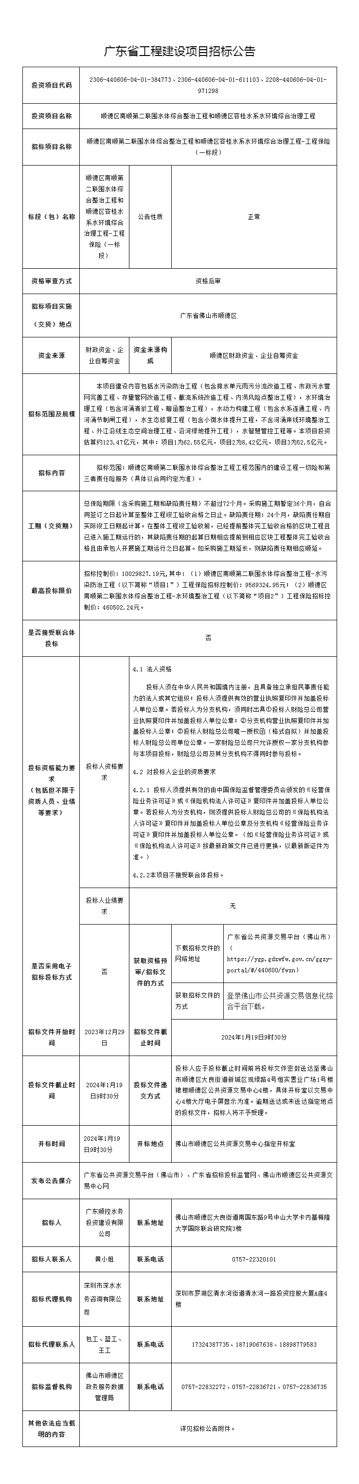顺德区南顺第二联围水体综合整治工程和顺德区容桂水系水环境综合治理工程招标公告
