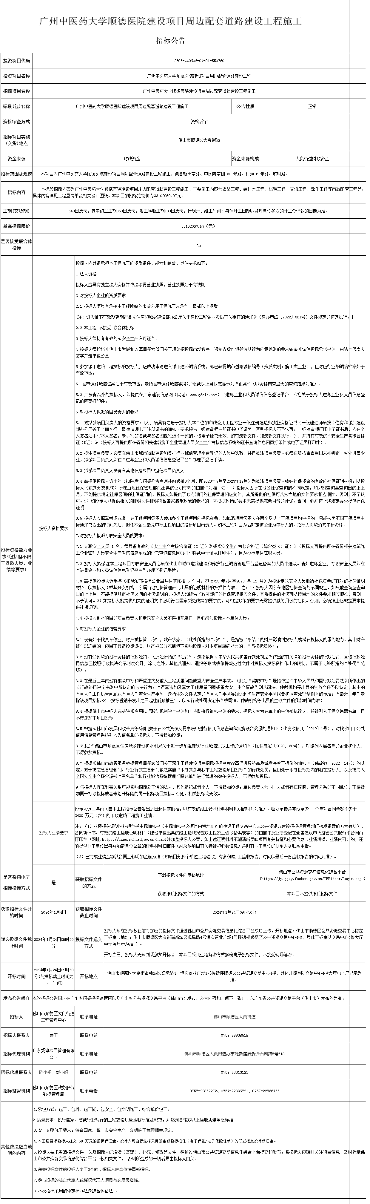 广州中医药大学顺德医院建设项目周边配套道路建设工程施工招标公告