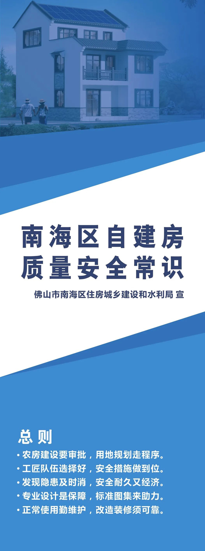 近日,佛山市南海区“百县千镇万村高质量发展工程”指挥部城镇建设专班办公室深入贯彻落实《广东省农房质量安全风貌提升和农房建设试点行动方案》部署,编制“南海区自建房质量安全常识”一张图,以通俗易懂的文字描述,和生动丰富的示例图片,从自建房建设选址、布局、建造、使用等方面作出质量安全提示。