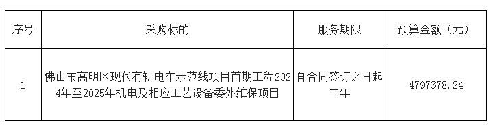 佛山市高明区现代有轨电车示范线项目首期工程2024年至2025年机电及相应工艺设备委外维保项目招标公告
