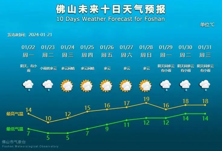 据佛山市气象台消息,1月21日起我市受到强冷空气影响,气温持续下降,平均气温14.2℃,1月22至23日冷空气持续补充,并伴有小雨,日平均气温下降6到8℃,1月23日、1月24日早晨将出现最低气温5℃左右。(来源:南方日报、@佛山天气)