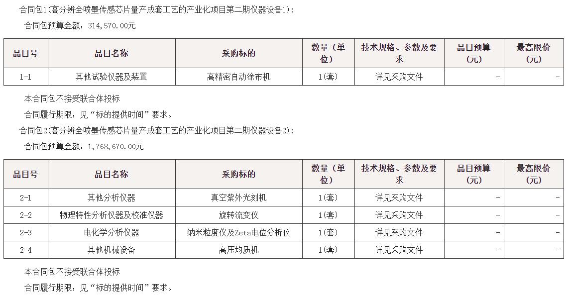 项目名称:高分辨全喷墨传感芯片量产成套工艺的产业化项目第二期仪器设备采购