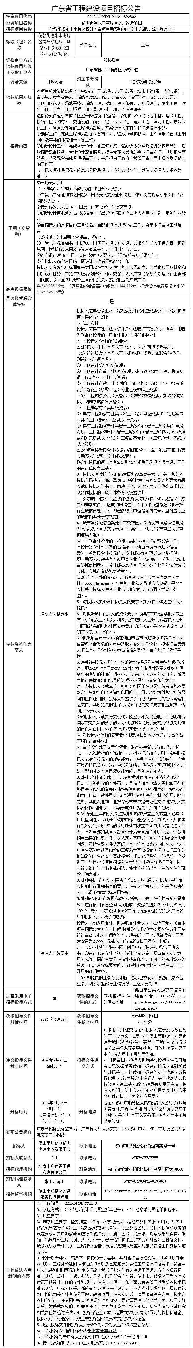 顺德伦教街道永丰南片区提升改造项目勘察和初步设计(道路、绿化和水体)招标公告