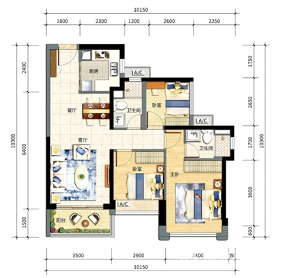 保利天寰在售6座户型图,其中03、04、05、06户型为101平方米的三房户型,客厅阳台朝向偏东南或西南,收纳偏南风。四种户型的房间都归边设计,显得格局方正,功能划一。美中不足是,主人套间的卫生间采光窗外面是与客厅相连的大阳台。