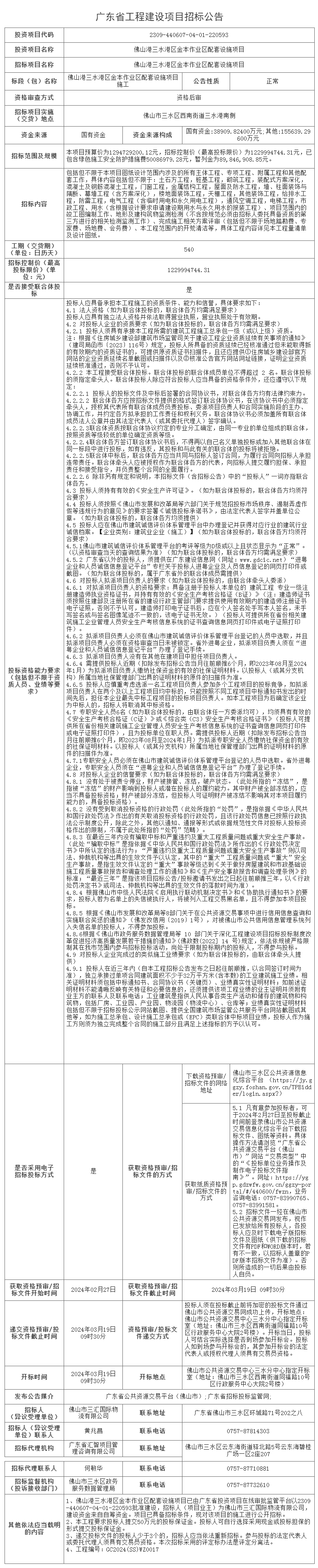 佛山港三水港区金本作业区配套设施项目施工招标公告