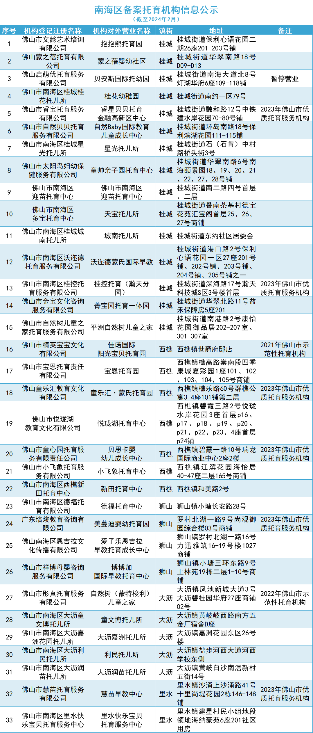 根据《关于印发托育机构设置标准(试行)和托育机构管理规范(试行)的通知》(国卫人口发〔2019〕58号)、《关于印发托育机构登记和备案办法(试行)的通知》(国卫办人口发〔2019〕25号)等相关规定及要求,截至目前,经托育机构申请、区卫生健康局审核,南海区共计有33家托育机构符合相关条件完成备案。现公示如下: