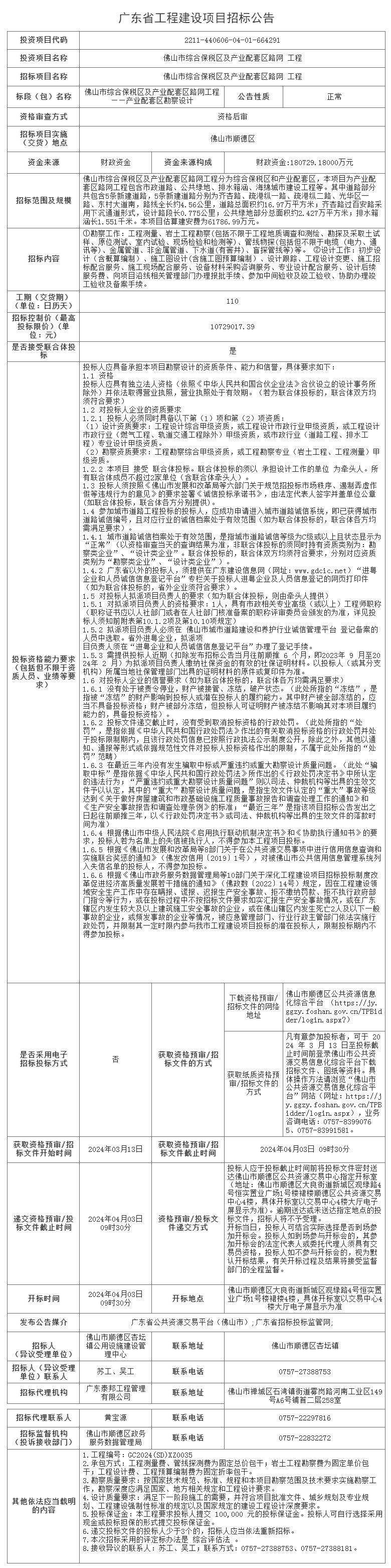 佛山市综合保税区及产业配套区路网工程——产业配套区勘察设计招标公告