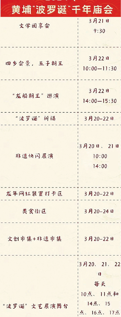 据了解,本届“波罗诞”将为市民群众提供一个可观、可赏、可玩的千年庙会。从3月20日至22日(即农历二月十一至二月十三)活动举办期间,每天10点、14点现场将放送精彩民俗演出活动。