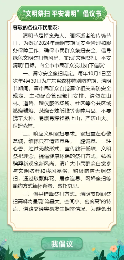 在寄送书信或者完成其他祭祀方式后,点击页面底部的“我倡议”,成为文明祭扫倡议人。