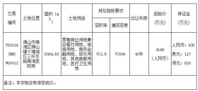 八、自本次公告起至网上挂牌截止期间,如有关于本宗地竞买文件的修改、澄清、说明等将通过网上交易系统以及佛山市南海区人民政府网发布,请有意参与竞买者密切留意。其它未尽事宜,详见本宗地的网上挂牌出让文件。