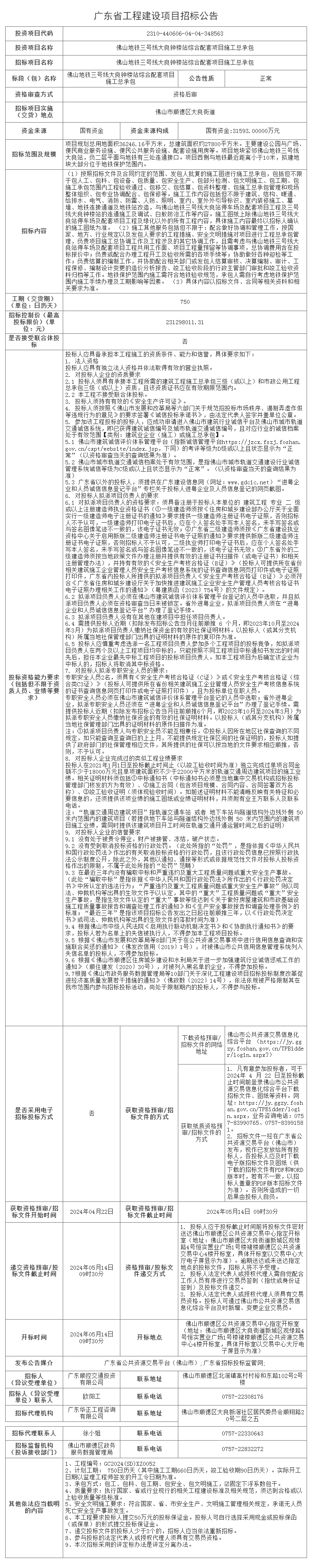 佛山地铁三号线大良钟楼站综合配套项目施工总承包招标公告