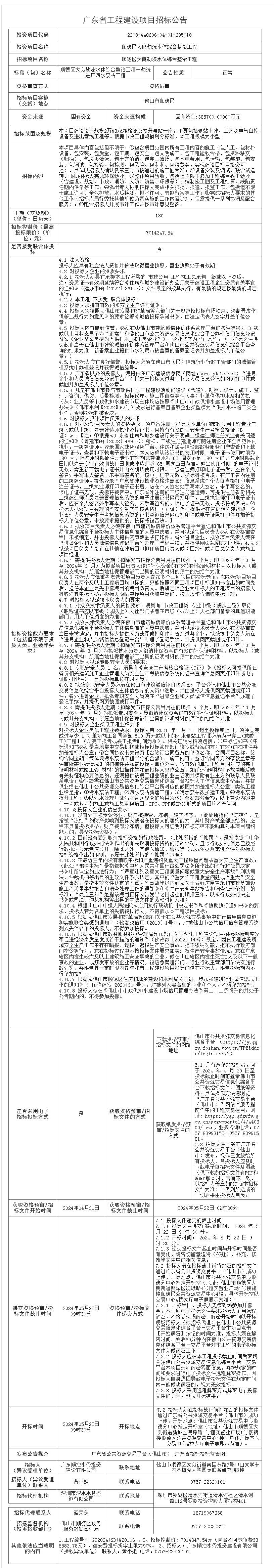 顺德区大良勒流水体综合整治工程—勒流进厂污水泵站工程招标公告