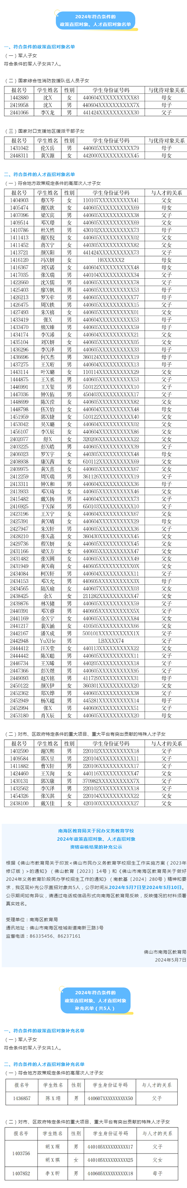 根据《佛山市教育局关于印发<佛山市民办义务教育学校招生工作实施方案(2023年修订版)>的通知》(佛山教育〔2023〕14号)和《佛山市南海区教育局关于做好2024年义务教育阶段民办学校招生工作的通知》(南教基〔2024〕280号)精神和要求,我区对已在市民办招生平台报名的政策直招对象、人才直招对象进行资格审核。现进行公示,公示时间从2024年5月6日至2024年5月9日。公示期间如有异议,请通过电话或信函形式向南海区教育局反映,反映情况的材料须署真实姓名。