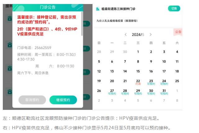 当前佛山HPV疫苗供应充足,全市五区众多接种门诊可预约二价、四价、九价,部分接种门诊甚至可以当场预约当场接种。