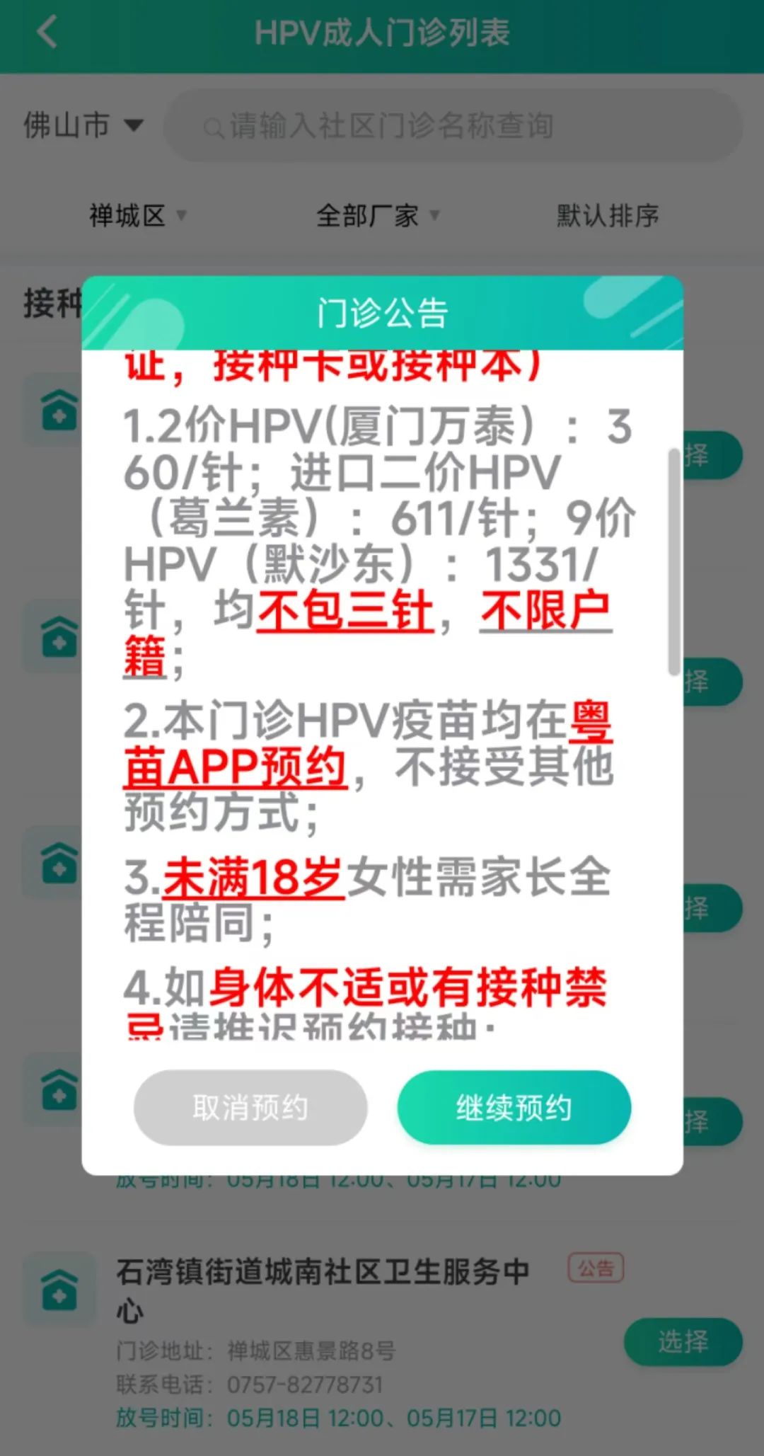 禅城区有接种门诊的门诊公告直接标出HPV疫苗价格。
