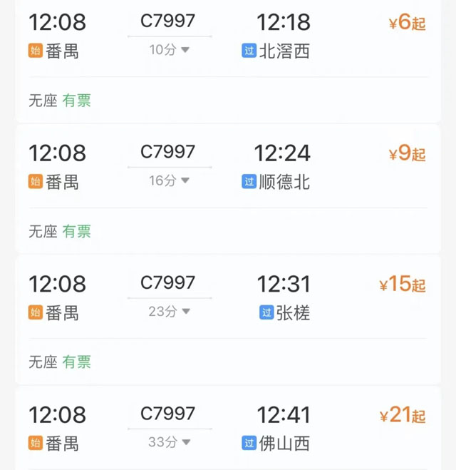 12306网站显示,广佛南环城际(佛山西站-番禺站)全程票价为21元,佛莞城际(番禺站-东莞西站)全程票价为22元,佛山西站到东莞西站的票价为45元。
