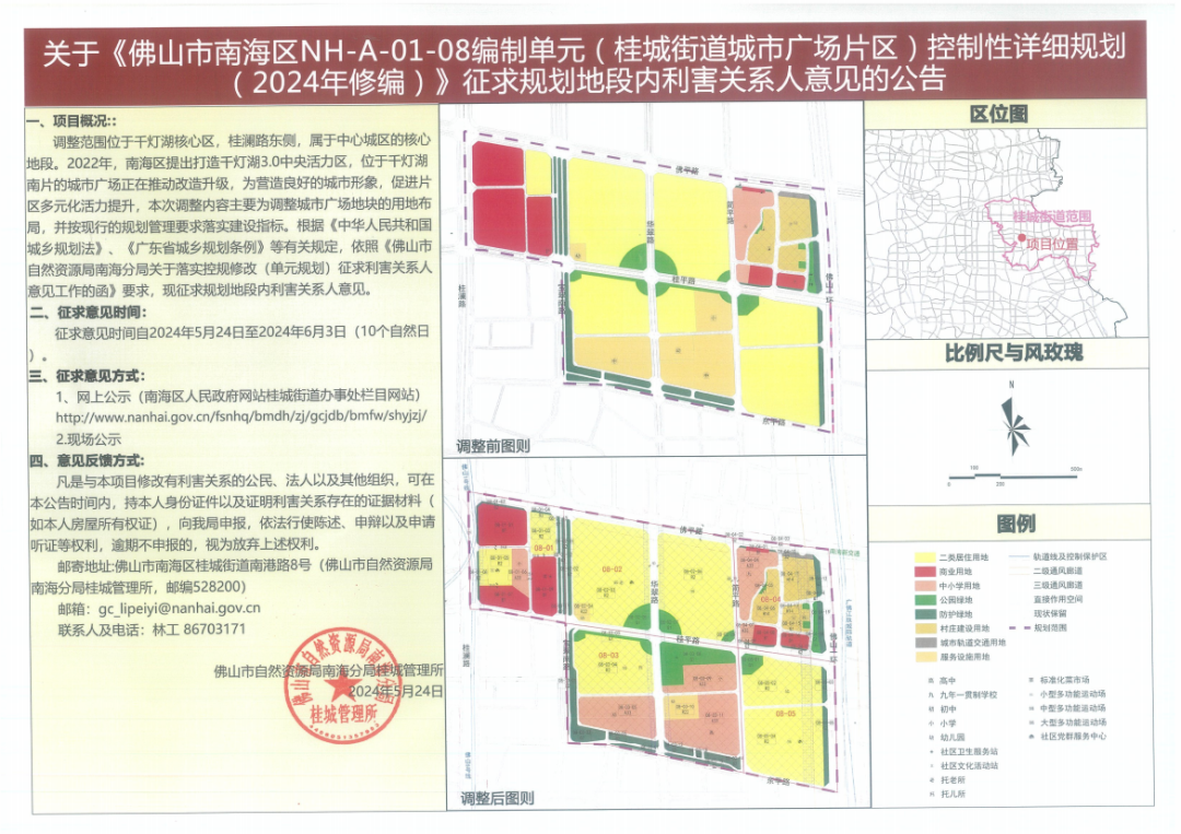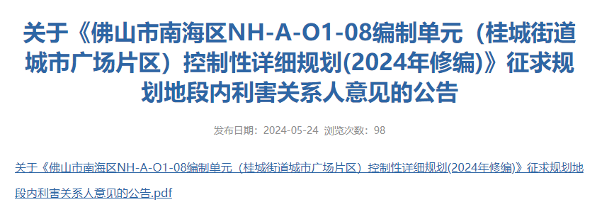 近日,桂城街道发布关于《佛山市南海区NH-A-O1-08编制单元(桂城街道城市广场片区)控制性详细规划(2024年修编)》征求规划地段内利害关系人意见的公告。