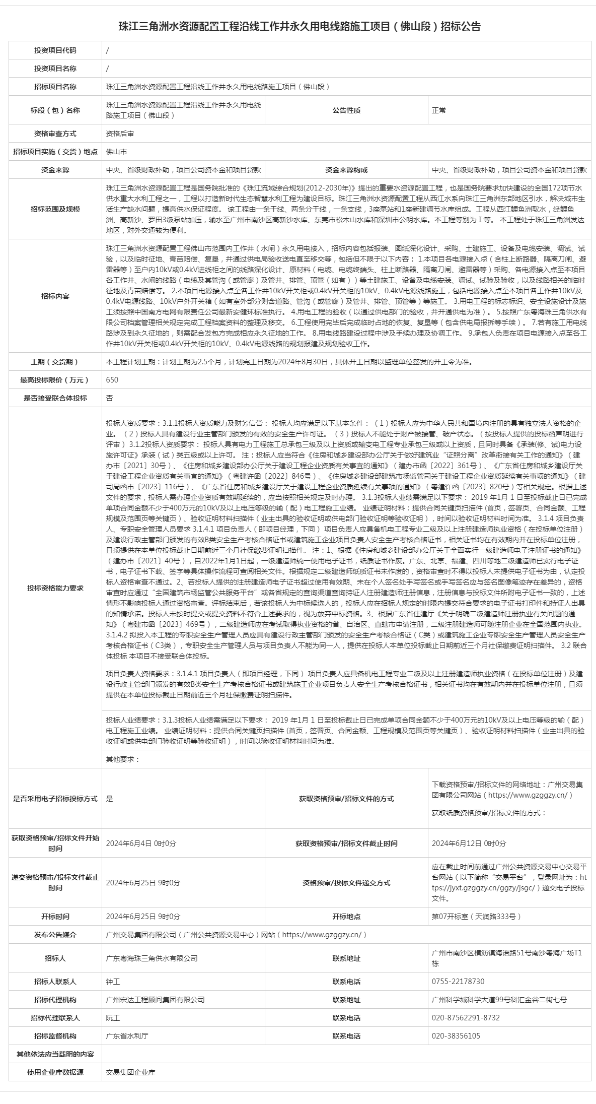 珠江三角洲水资源配置工程沿线工作井永久用电线路施工项目(佛山段)招标公告