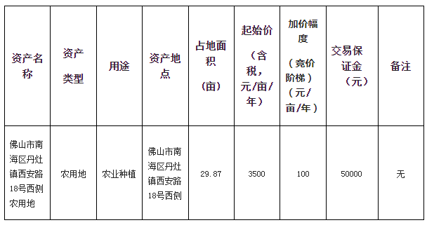 概述:佛山市南海区丹灶镇公共资源交易所受佛山市南海区丹灶产业开发集团有限公司的委托,现就丹灶镇金沙城区桂丹西路5号西侧地块租赁项目采用网上竞价方式进行租赁......
