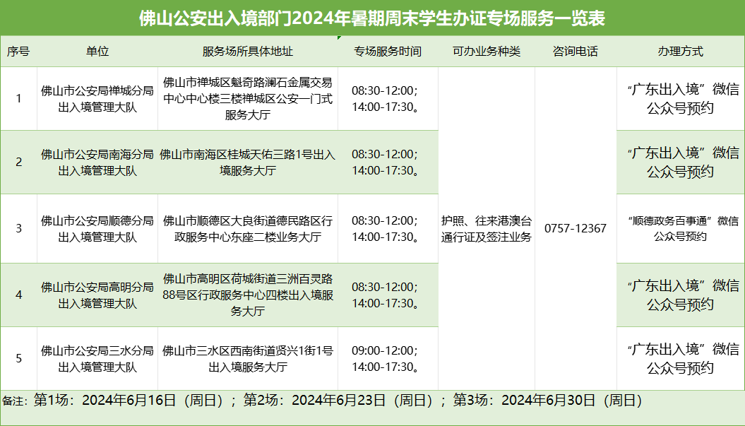 1.预约禅城、南海、高明、三水区专场服务的,可通过“广东出入境”微信公众号预约。
