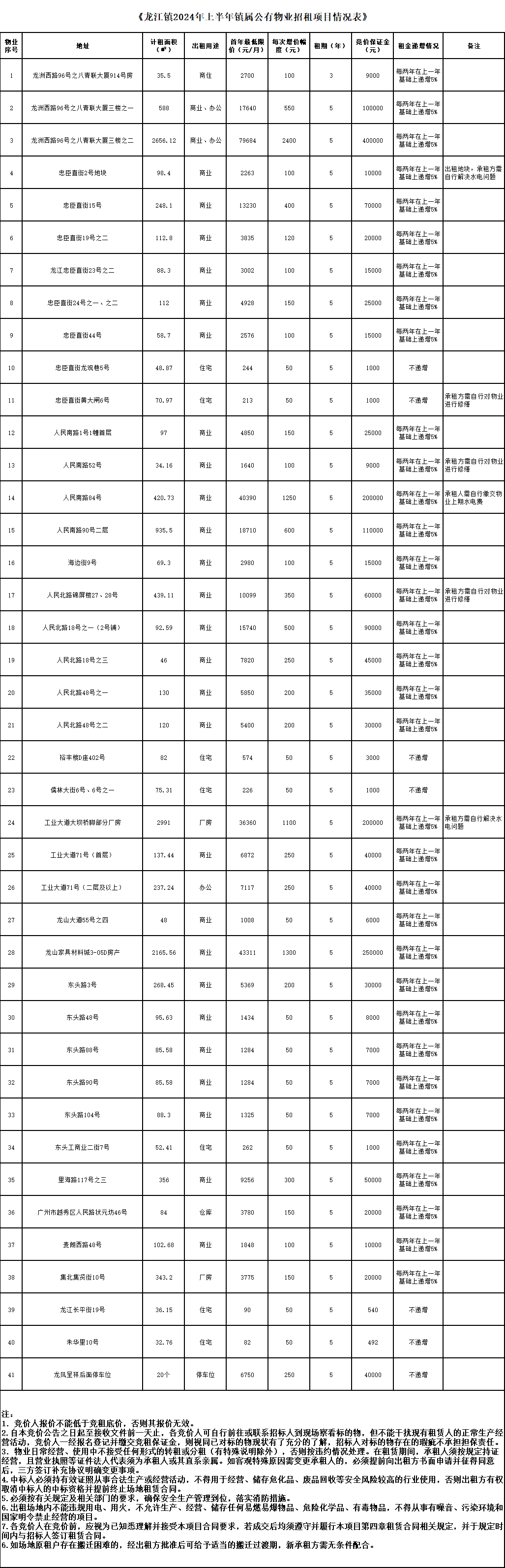龙江镇2024年上半年镇属公有物业招租项目位于佛山市顺德区龙江镇,出租物面积情况。