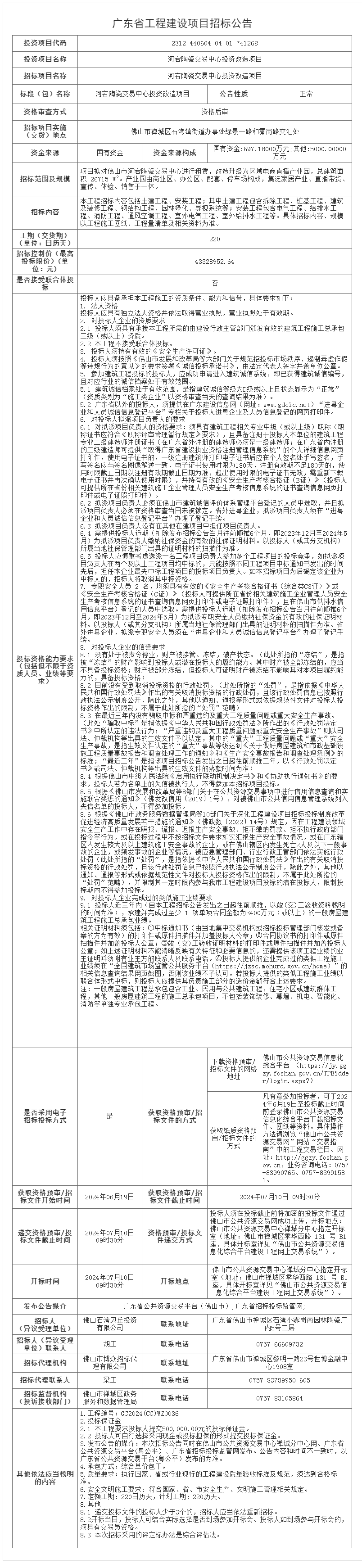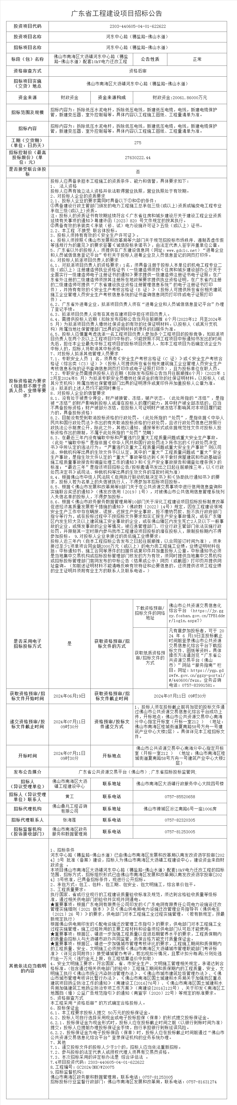佛山市南海区大沥镇河东中心路(穗盐路-佛山水道)配套10kV电力迁改工程招标公告