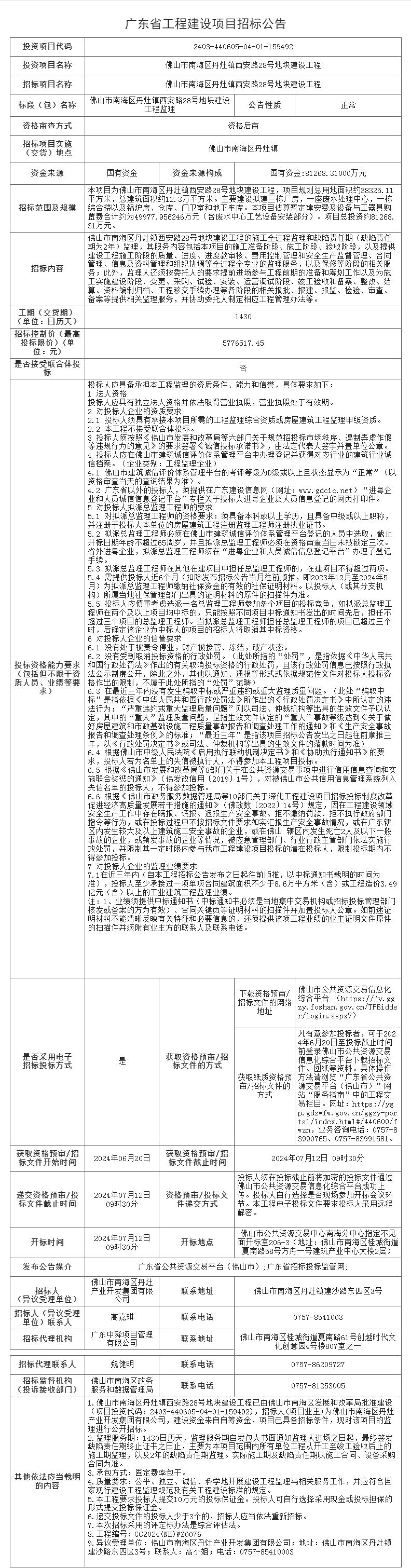 佛山市南海区丹灶镇西安路28号地块建设工程监理招标公告