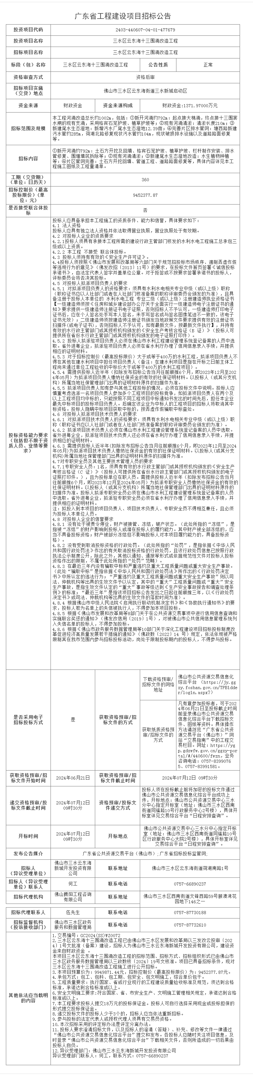 三水区云东海十三围涌改造工程招标公告