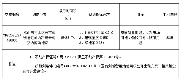 五、有意参与竞租者可于2024年6月25日后登录网上交易系统下载TD2024(SS)WG0006地块的《佛山市三水区国有划拨留用地使用权网上挂牌出租文件》。