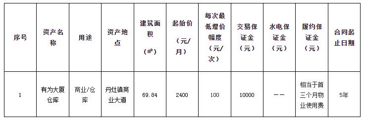 佛山市南海区丹灶镇公共资源交易所受佛山市南海区丹灶镇建设发展总公司的委托,现就有为大厦仓库物业出租项目采用网上竞价方式进行租赁,欢迎合格的竞价意向人前来报价。