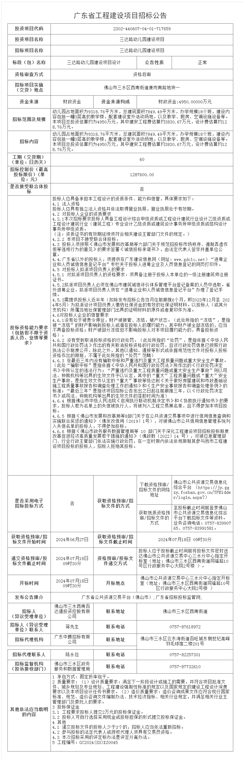 三水区西南街道三达路幼儿园建设项目设计招标公告