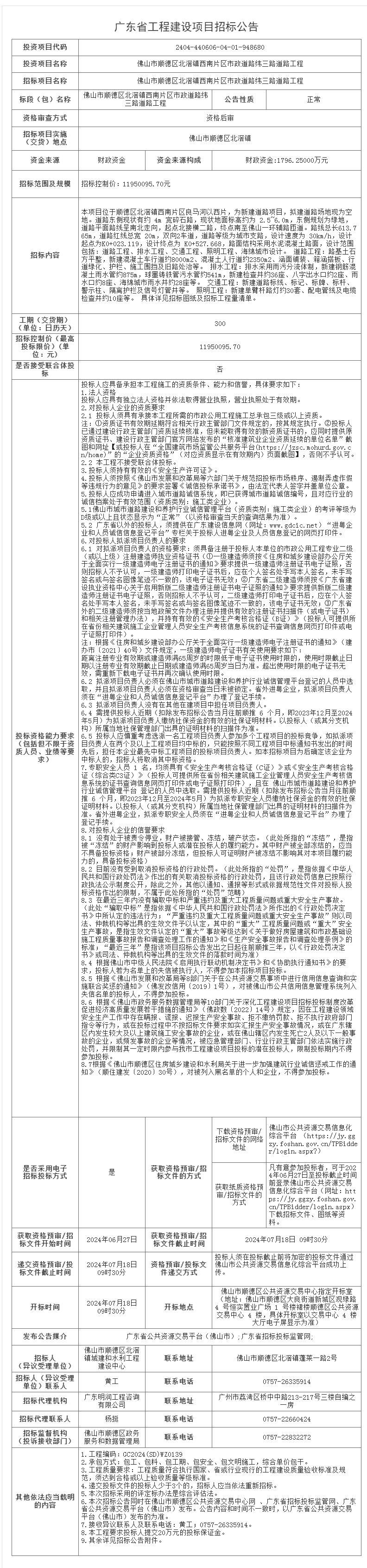 佛山市顺德区北滘镇西南片区市政道路纬三路道路工程招标公告