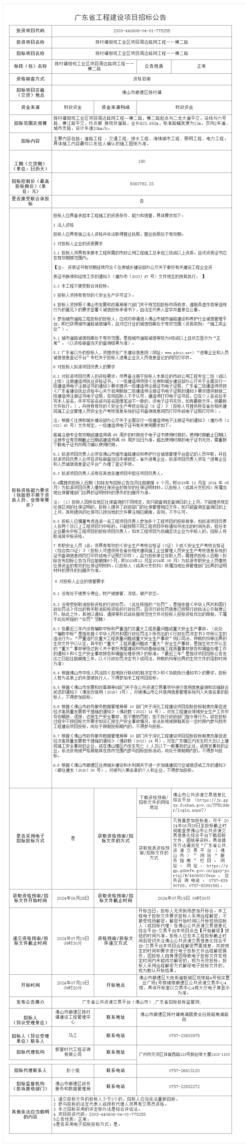 顺德陈村镇绀现工业区项目周边路网工程——横二路 招标公告
