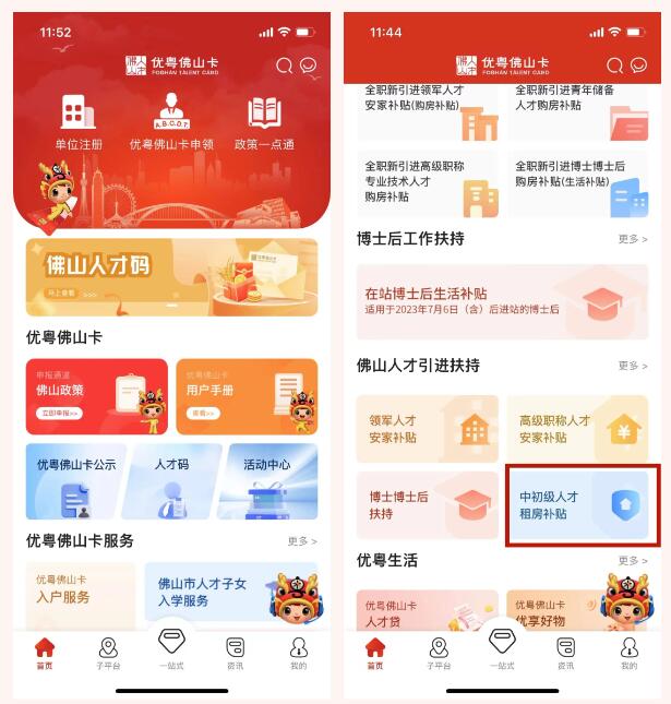 1.进入【优粤佛山卡APP】首页,向下滑动至“佛山人才引进扶持”,点击【中初级人才租房补贴】进入资格复核入口。