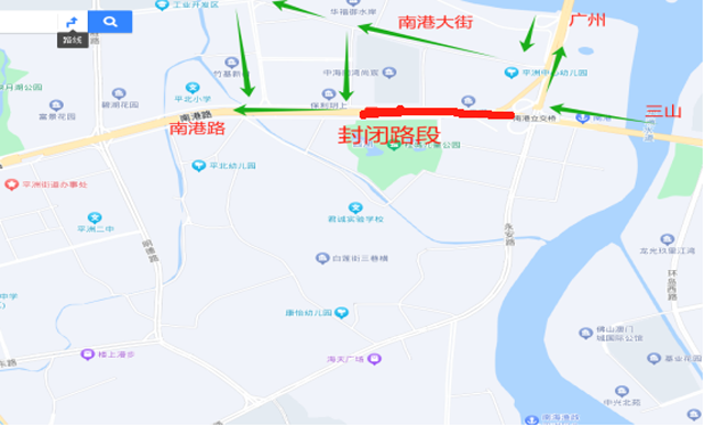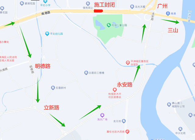 ② 三山往桂城方向过境车辆请绕行三山西大桥→南港大街(掉头进入)→南港路主路。