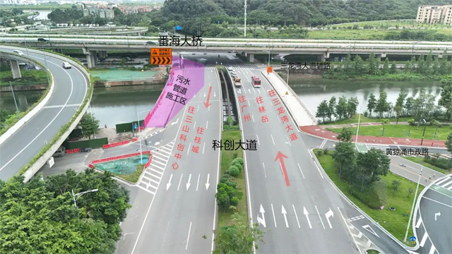 占道施工范围:科创大道黄猄涌中桥占用南往北左侧2个车道和北往南左侧1个车道围蔽施工。