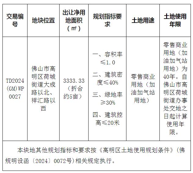 十、自本次公告起至网上挂牌截止期间,如有关于本宗地网上挂牌文件的修改、澄清、说明等将通过广东省公共资源交易平台、佛山市国有建设用地使用权和矿业权网上交易系统进行发布,有意参与竞买者的请密切留意。其它未尽事宜,详见该地块的交易文件。