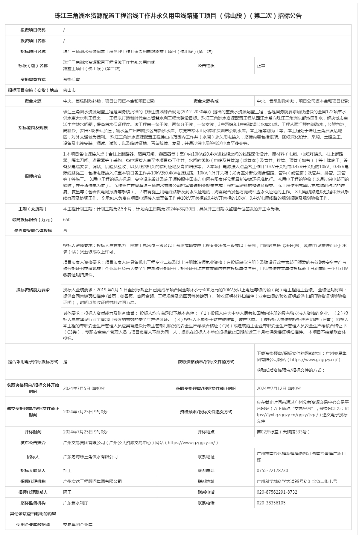 珠江三角洲水资源配置工程沿线工作井永久用电线路施工项目(佛山段)(第二次)招标公告