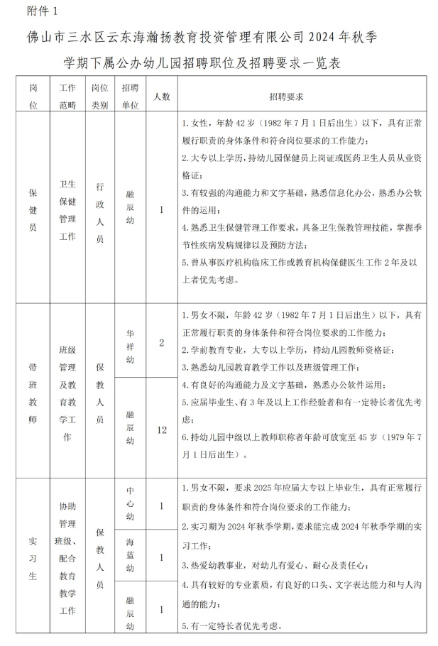附件1:云东海瀚扬教育投资管理有限公司2024年秋季学期下属公办幼儿园招聘职位及招聘要求一览表