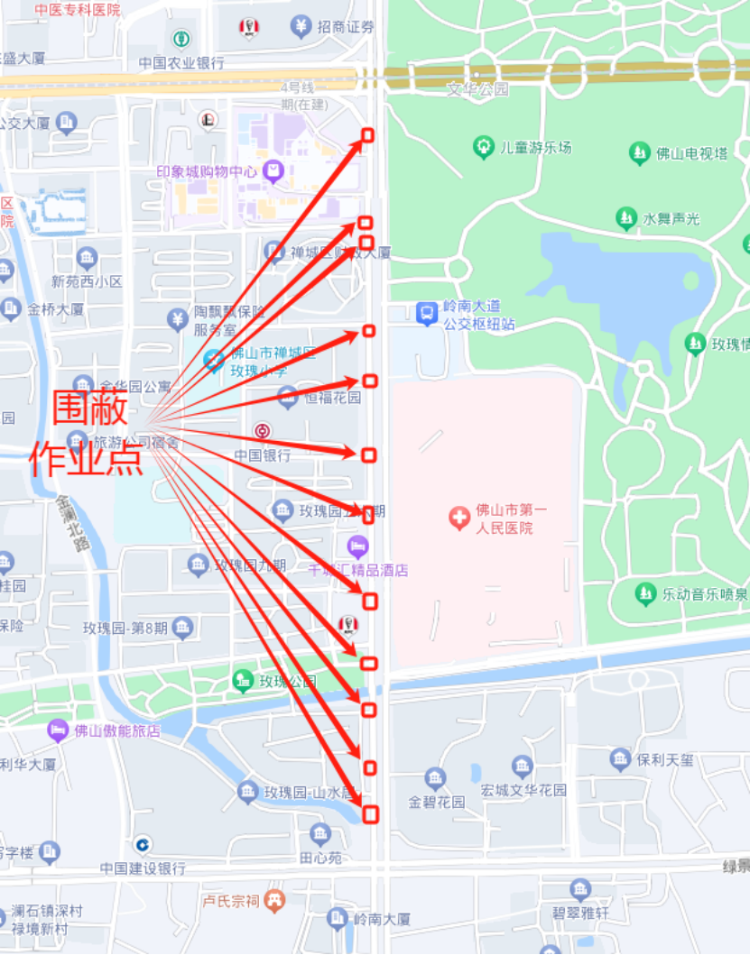 岭南大道(季华路-绿景路)北往南方向中间两车道局部位置,围蔽位置由四车道减至两车道。具体位置和交通疏导详见如下: