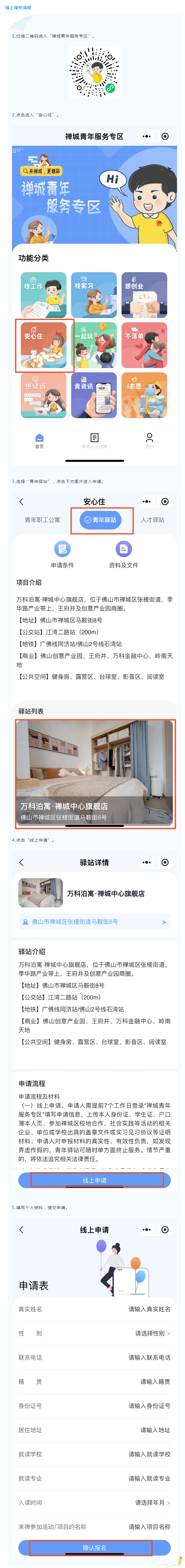 申请人需提前7个工作日登录“禅城青年服务专区”填写申请信息,上传本人身份证、学生证、户口簿本人页、参加禅城区校地合作、社会实践等活动的相关企业、单位或学校出具的盖章文件或实习见习协议等证明材料;申请人对申报材料的真实性、有效性负责,如发现弄虚作假的,青年驿站可随时单方面终止服务。情节严重的,将依法追究相关法律责任。