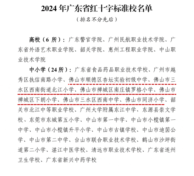 近日,广东省红十字会、广东省教育厅联合公布了2024年广东省红十字标准校名单,佛山市共有6所学校成功获评“广东省红十字标准校”。