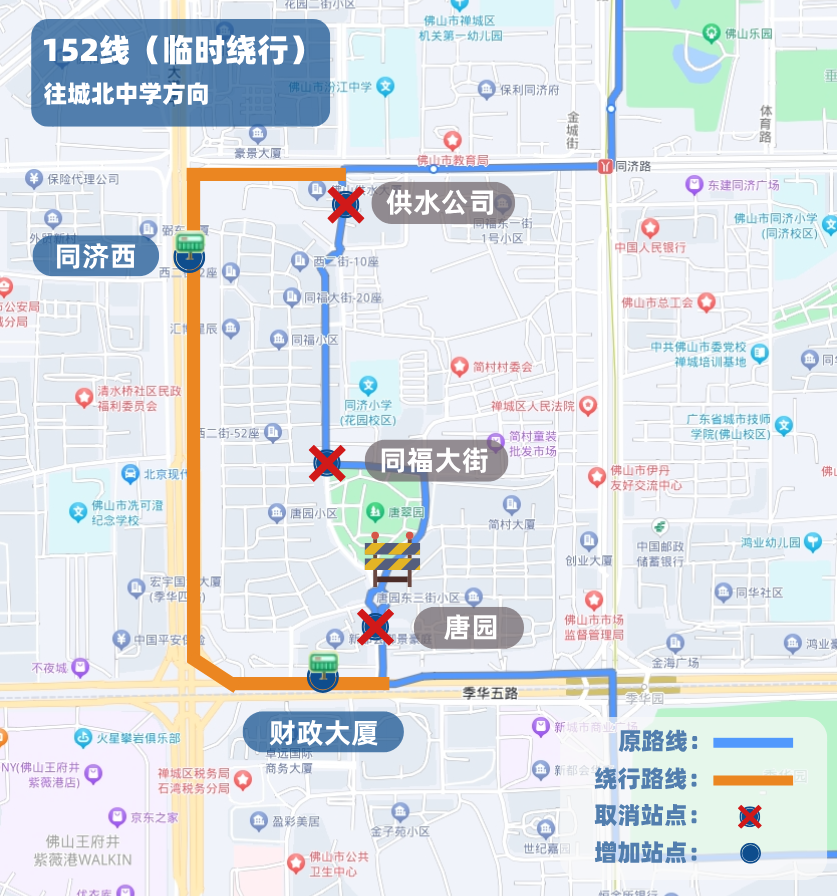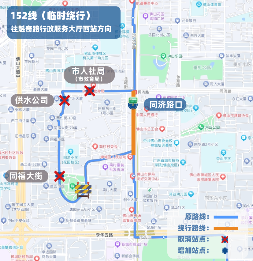 取消行驶唐园中路、唐园路、同福大街,绕行季华五路(唐园中路-佛山大道)、佛山大道、同济西路后接回原线路行驶。