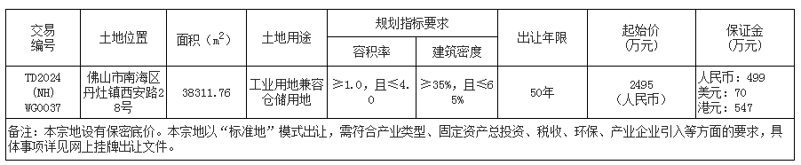 八、自本次公告起至网上挂牌截止期间,如有关于本宗地竞买文件的修改、澄清、说明等将通过网上交易系统以及佛山市南海区人民政府网发布,请有意参与竞买者密切留意。其它未尽事宜,详见本宗地的网上挂牌出让文件。