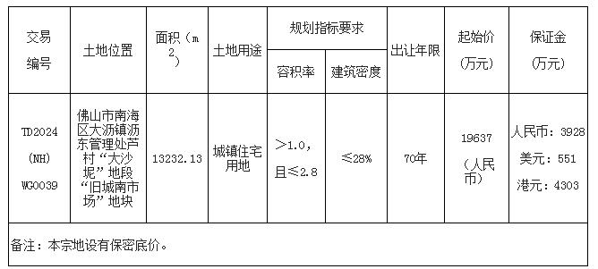 经佛山市人民政府批准,佛山市自然资源局决定委托佛山市公共资源交易中心南海分中心采用网上挂牌方式出让下列地块的国有建设用地使用权。现将有关事项公告如下: