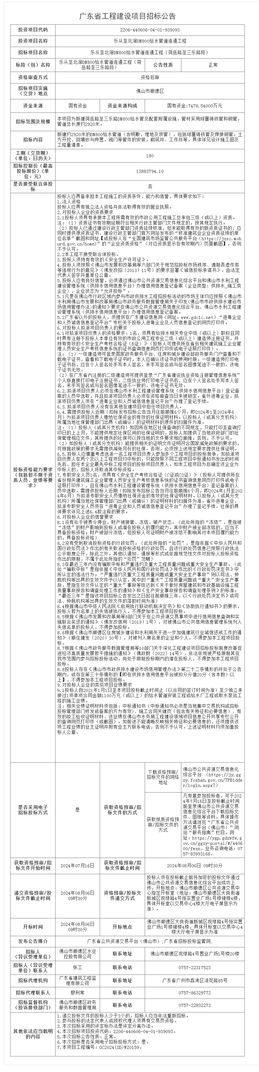 顺德乐从至北滘DN800给水管道连通工程(荷岳路至三乐路段)招标公告